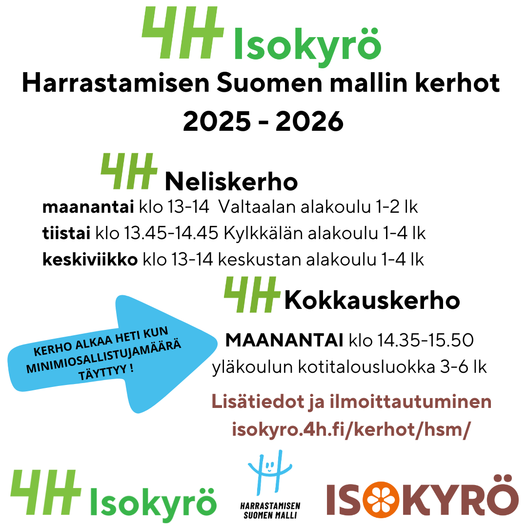 Isonkyrön 4H-yhdistyksen tuottamiin HSM-kerhoihin ilmoittautuminen tapahtuu alla olevalla lomakkeella.