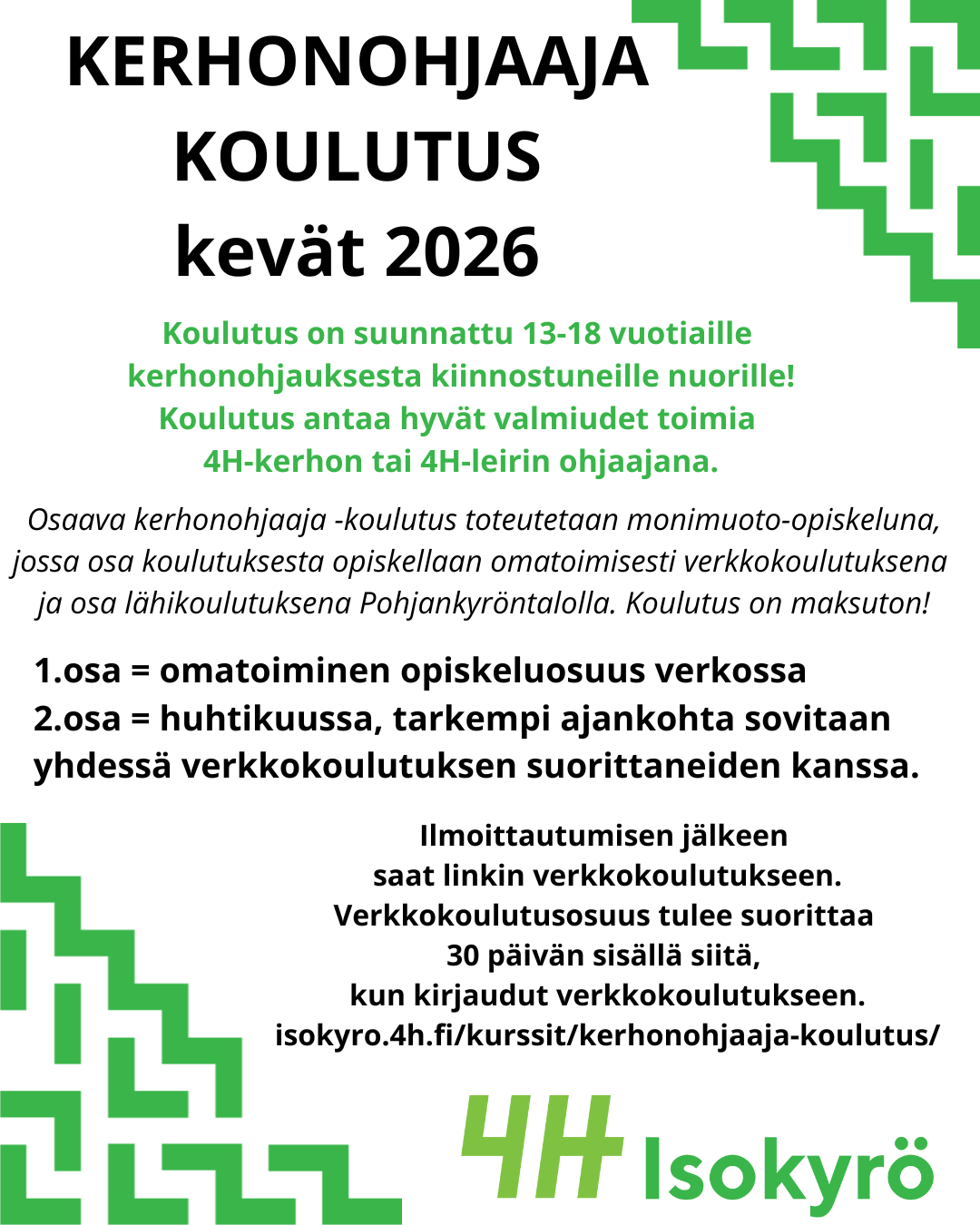 Lähikoulutus toteutetaan Pohjankyröntalolla huhtikuussa, ajankohta sovitaan yhdessä verkkokoulutuksen suorittaneiden kesken lähempänä huhtikuuta.