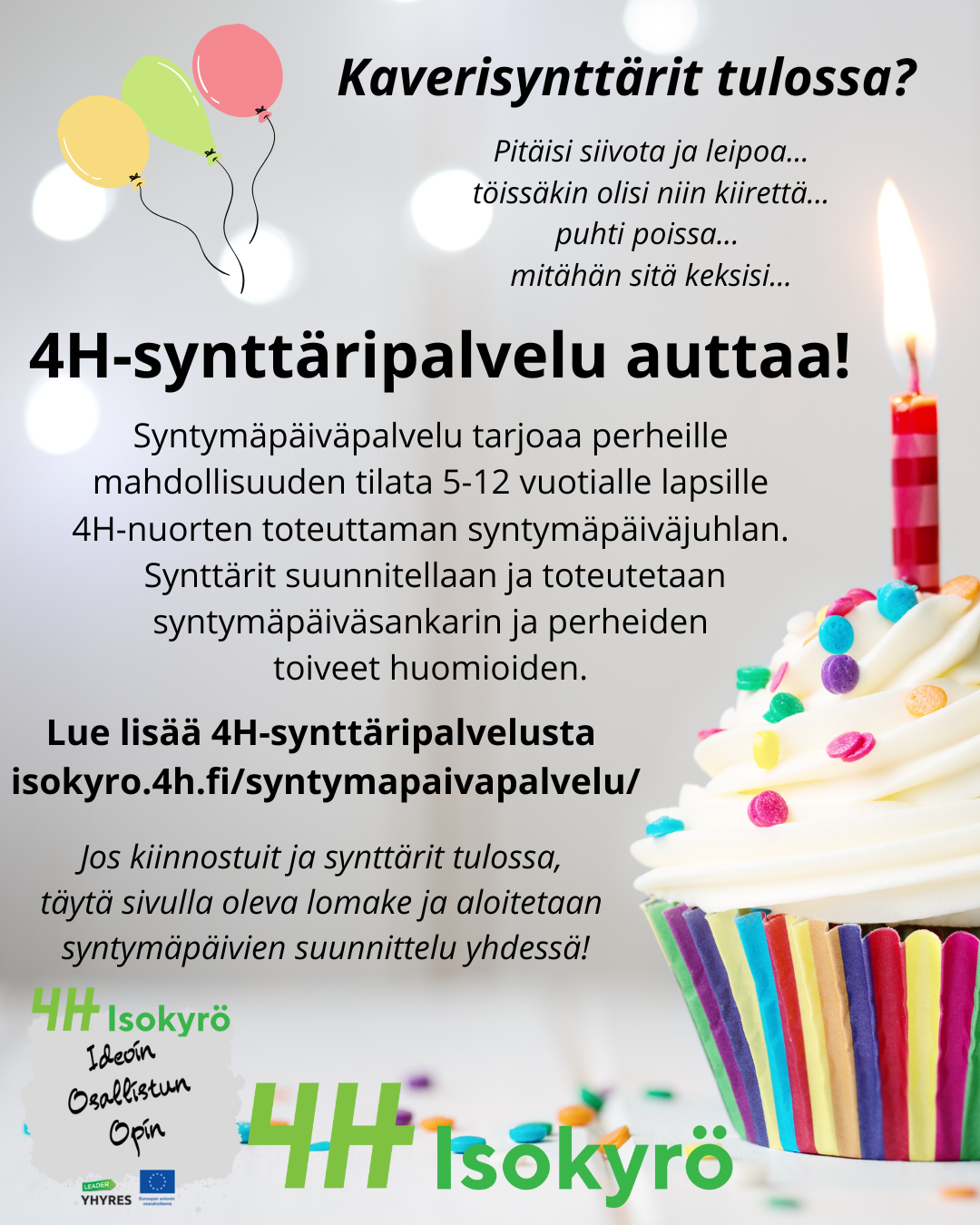 Syntymäpäiväpalvelu -toiminta on osa Isonkyrön 4H-yhdistyksen Ideoin, osallistun ja opin! -hanketta, joka on saanut EU-maaseuturahoitusta YHYRES-kehittämisyhdistyksen kautta.