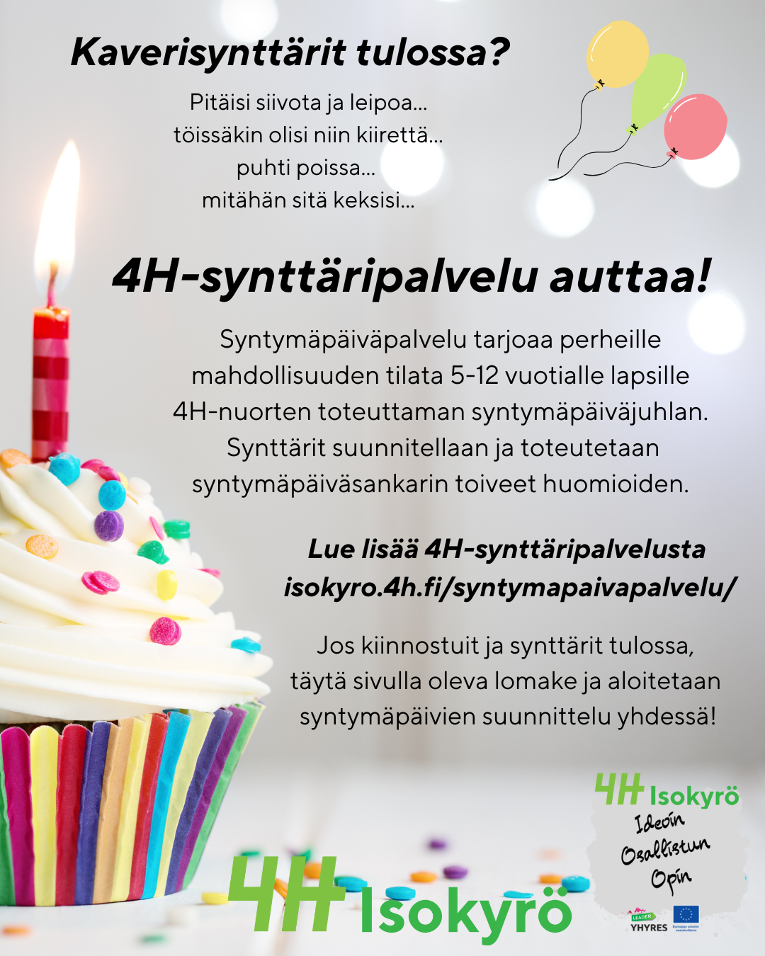 Syntymäpäiväpalvelu -toiminta on osa Isonkyrön 4H-yhdistyksen Ideoin, osallistun ja opin! -hanketta, joka on saanut EU-maaseuturahoitusta YHYRES-kehittämisyhdistyksen kautta.